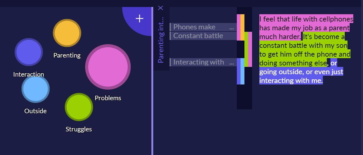 Quirkos also has specific tools to help higher-level categorisation, letting you visualise how often codes are overlapping on sections of text (using the Overlap view).